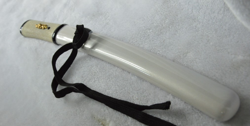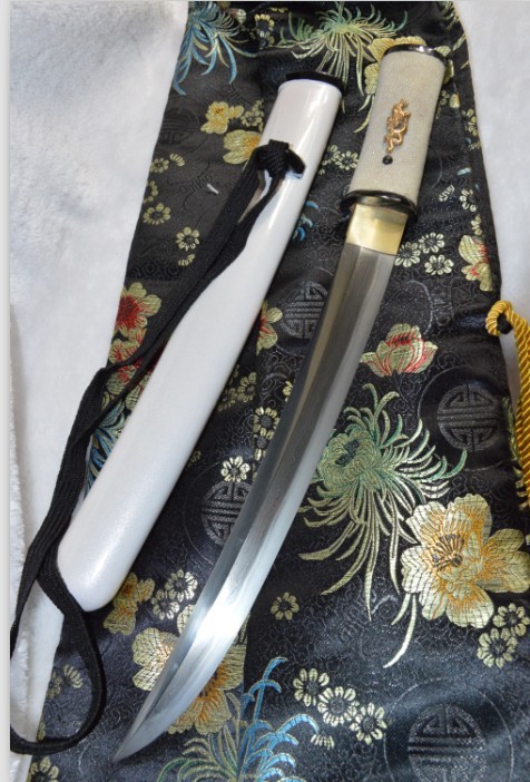挚 隼菖蒲造短刀三枚合结构 覆土烧刃 淬反 上研皮铁为自家熔炼 11折(2的12次方,理论数值8192层) 芯铁T10刀柄包裹上等优质鱼皮 牛角配件 鎏金目贯 可自选颜色全长46.5 刃长30 柄长12 元幅3.1(手工制品 存在误差)赠品: 锦盒 刀袋图片摄于2013年,单反拍摄