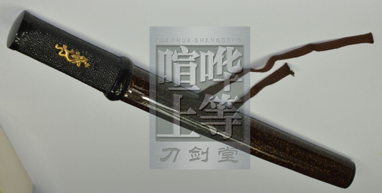 尊三短刀 甲伏锻结构 平造皮铁为自家熔炼 芯铁为55号钢皮铁14折(2的15次方,理论数值32768层) 纹理非常之细腻!喧哗堂经典代表!覆土烧刃 淬反 上研(地艳、刃艳)刀柄包裹上等优质鱼皮 牛角配件 鎏金目贯 全长43 刃长28 柄长12元幅2.8 元重0.65(手工制品 存在误差)赠品:锦盒、刀袋图片摄于2014年,单反拍摄