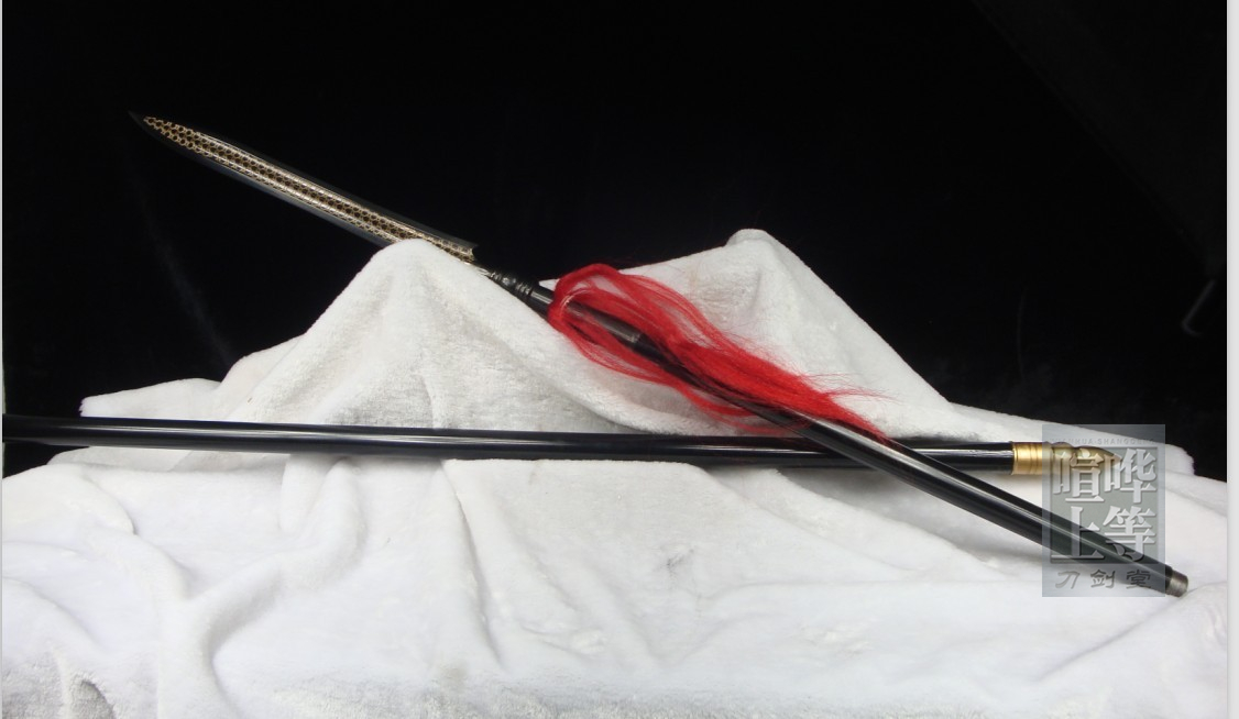 豪 (二代)刃材T10钢 高性能淬火 腐刻鎏金枪杆铁质 内螺牙对接 充分保证稳定性全长250 刃长46 刃宽4-5枪套长度20 枪杆直径3.2 厚度0.7-1.1可拆卸三节 全重4.7公斤左右(手工制品 存在误差)赠品: 锦盒图片摄于2010年,卡片机拍摄
