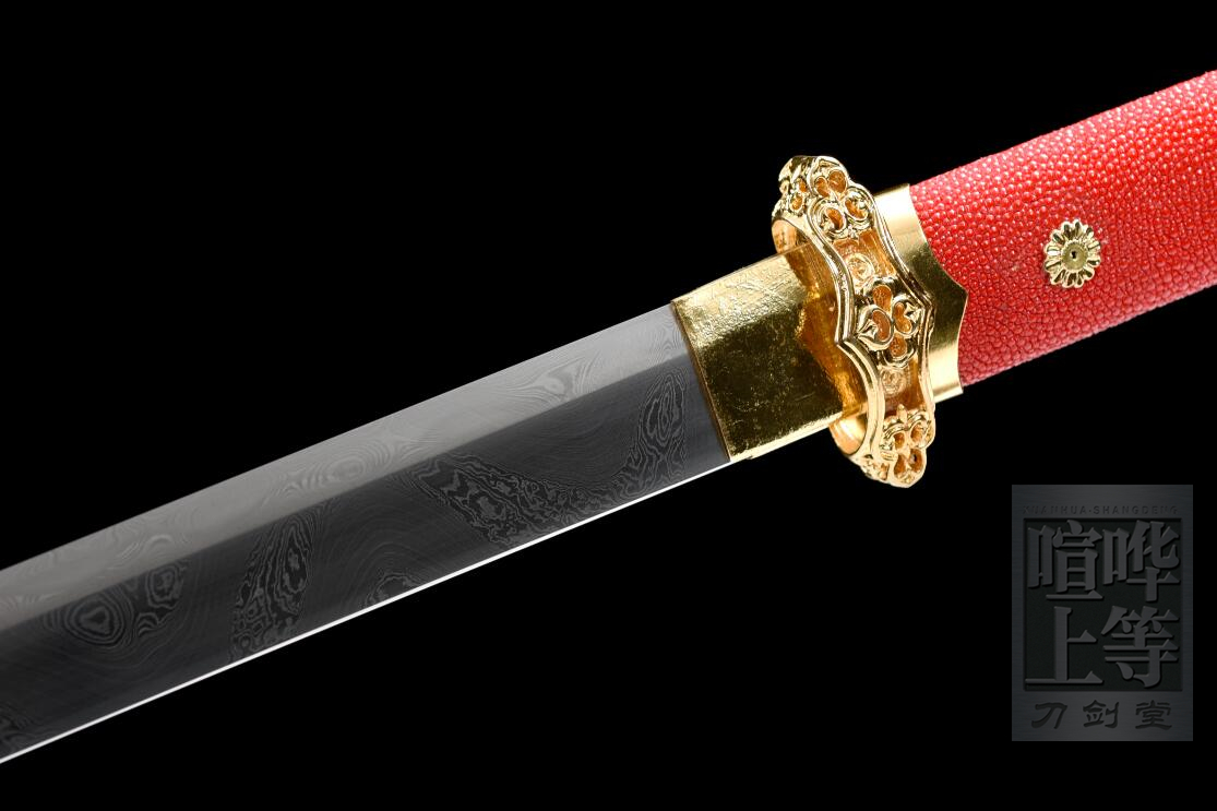 鎏金装旋涡纹唐刀 自家熔炼钢材精锻 古法旋焊旋涡纹 覆土烧刃 精细上研 高档镂空鎏金铜装 鎏金抛光 整鞘整张优质鱼皮(熟皮) 刀柄优质鱼皮包裹 纹理细腻 极致耐看 做工精细 手感优良 性能暴力 全长107 刃长77 柄长26.5 厚度0.7-0.4 宽度3.2-2.3 重量1.5千克 出鞘后1.1千克 (手工制品 存在误差) 赠品:精美锦盒 刀架 刀袋 保养工具图片摄于2020年,单反拍摄 观赏视频:https://www.bilibili.com/video/BV1G54y1U7Mi/
