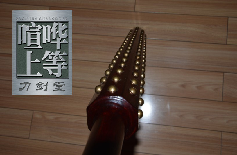 鬼 金 棒(日本传统钝器) 800元 关于材质: 起初打算用柞木或黄檀这类的硬木去制作,到了木材市场后,告知木材老板我们的用途后,木材老板推荐了这个高强度的材料,说是几年前进口过来的,具体是什么材料,这个老板也说不好,但是强度足矣可以满足我们的需要。上面镶嵌的铜钉是我们定制的,实心的黄铜鼓钉,钉子直径1.4CM,为了更为结实耐用我们将钉长(不含钉帽)做到2.1CM,牢牢地钉死在木料上。每个鬼金棒需要镶嵌140颗铜钉。整体重量在7斤多。 数据在图上有具体呈现 请认真查看 图片摄于2013年,卡片机拍摄             |