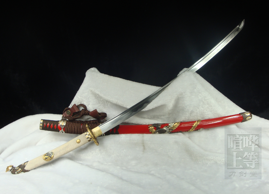 赤 鳯 T10钢油淬 化妆研 高档太刀装(铜制、鎏金鎏银) 刀柄通体包裹上等鱼皮 颜色风格可自由搭配手感优良 霸气凛然!全长110 刃长71 柄长31.5 元幅3.2 先幅2.3 元重0.73 先重0.43 反2.45(手工制品 存在误差)赠品:刀架 刀袋 锦盒此产品为客户定制,摄于2013年,单反拍摄